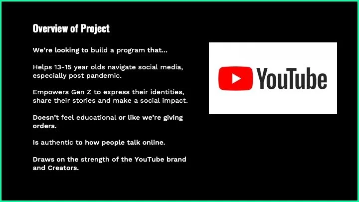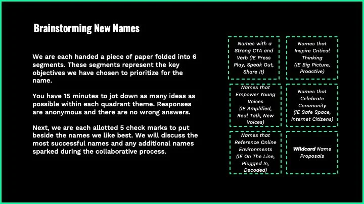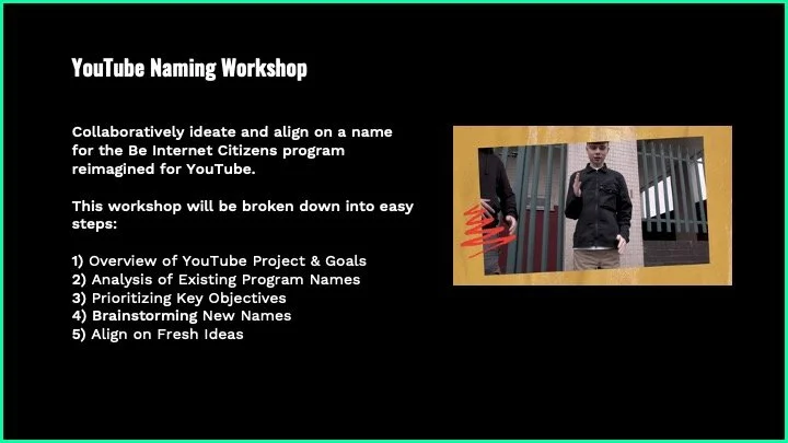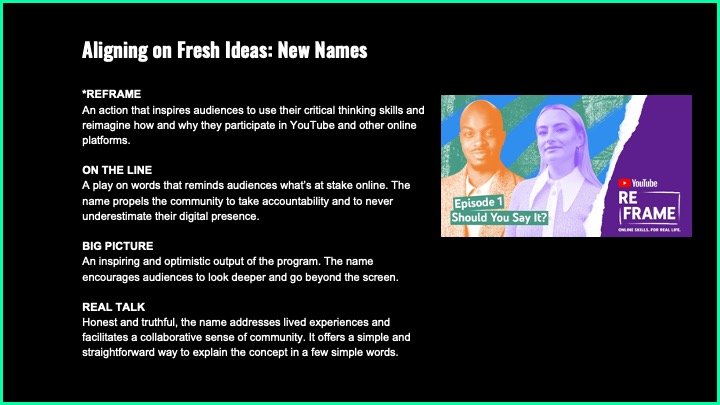I also led a group Naming Workshop with Platform 13 and members of YouTube’s UK marketing team, which resulted in the final program name REFRAME. This name felt impactful as it is was both a verb and and a call to action, inspiring young people to use their critical thinking skills and reimagine how they participate in YouTube and other online platforms. The steps of the YouTube Naming Workshop are highlighted below.