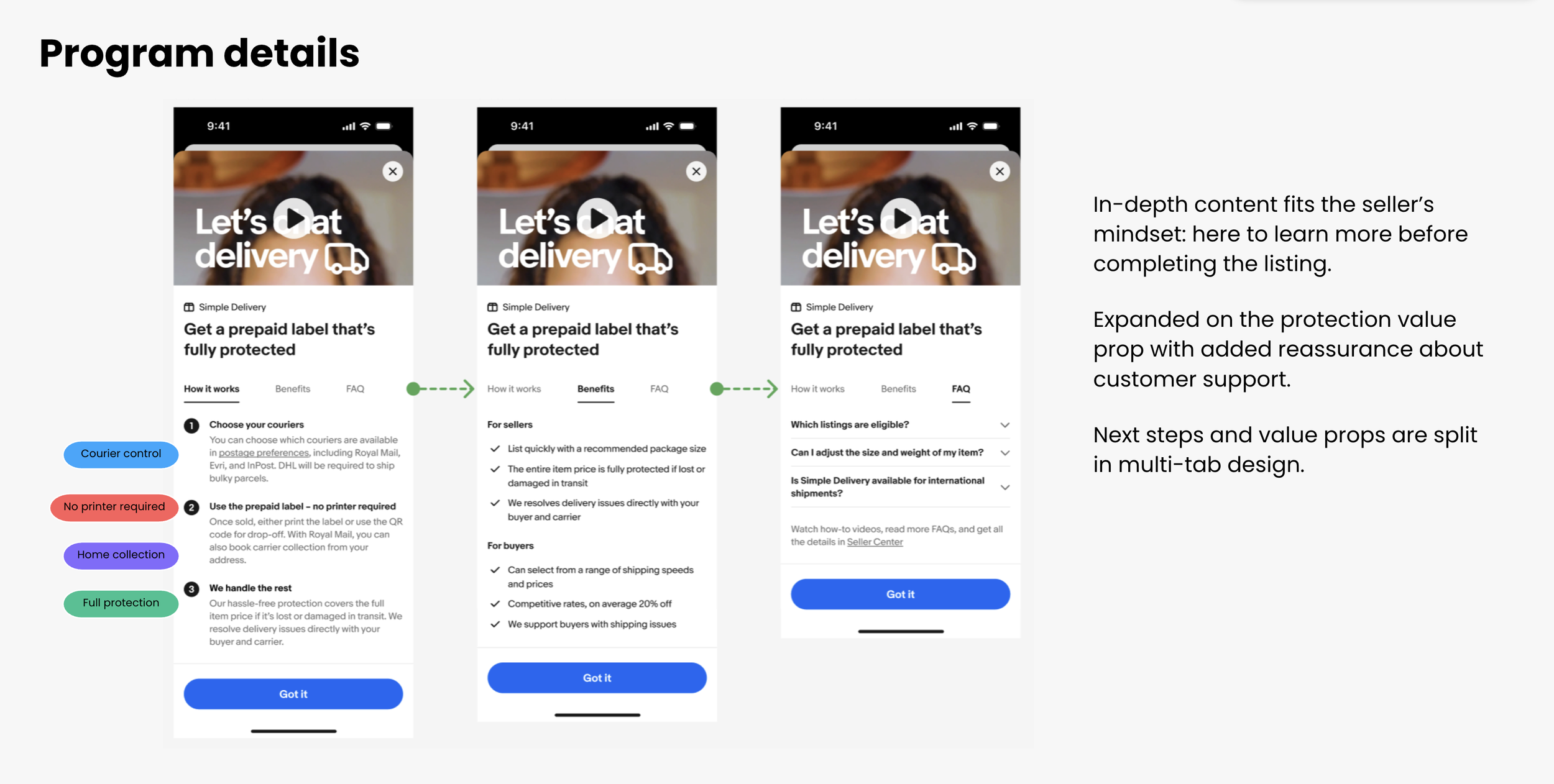 Research showed that clarity, control, and reassurance are the strongest drivers of adoption. Sellers needed contextual, step-by-step guidance to understand how the service works, when it applies, and what they control.